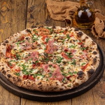 Пицца из дровяной печи со слайсами ветчины из индейки, томатным соусом, шампиньонами, петрушкой и домашней Моцареллой