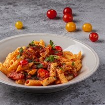 Домашняя паста в томатном соусе с добавлением чеснока, свежего базилика, петрушки и помидоров черри