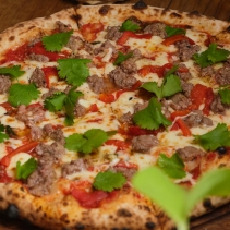 Пицца из дровяной печи с фаршем из баранины, запеченным болгарским перцем, томатным соусом, Моцареллой и кинзой