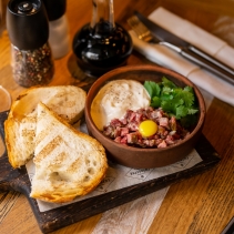 Ростбиф, горчица дижонская, масло оливковое, соль морская, томаты вяленые, каперсы, Страчателла, кинза, яйцо перепелиное, чиабатта, лук красный
