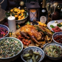 Запеченная утка (2,5 кг.), мясное ассорти (400 г.), рыбное ассорти (500 г.), сырное ассорти (800 г.), ассорти грибов (200 г.), ассорти солений (600 г.), салат оливье (1,1 кг.), винегрет (1 кг.), мандарины, апельсины (1 кг.)