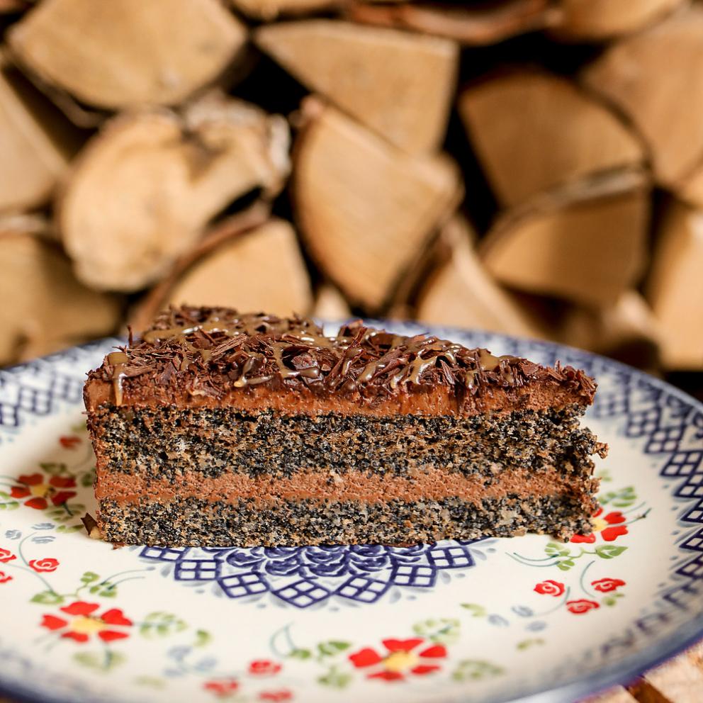 Насыщенный шоколадный бисквит с маковой начинкой и карамельной глазурью