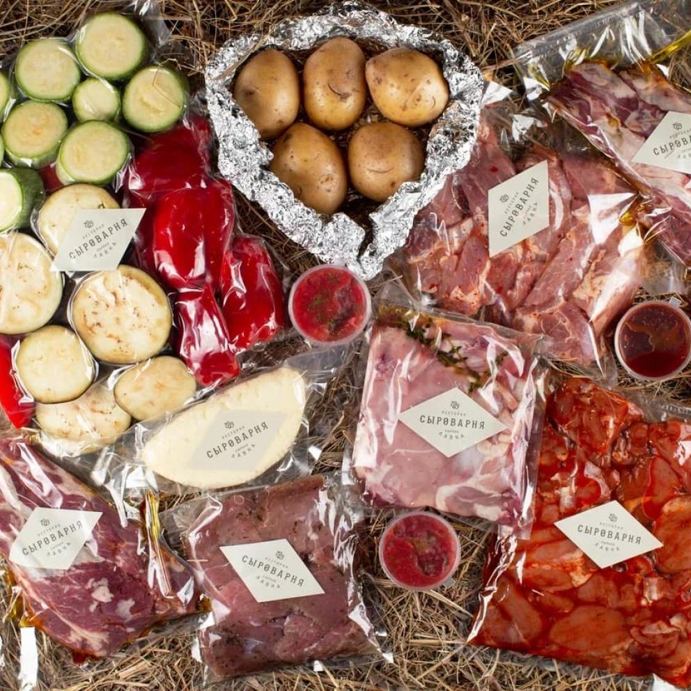 Шашлык из курицы 500 гр., шашлык из свинины 500 гр., сыр Халлуми 200 гр., картофель для запекания 400 гр., маринованный кабачок 200 гр., маринованный баклажан 200 гр., маринованный перец болгарский 200 гр., аджика 100 гр., соус барбекю 100 гр.