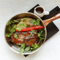 Тушеный козленок с овощами и соусом демиглас, баклажаном и баклажанной икрой, кинзой и перцем чили