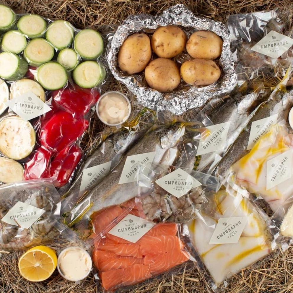 Форель 400 гр., кальмар 150 гр., креветки 100 гр., маринованный кабачок 150 гр., маринованный баклажан 150 гр., маринованный перец болгарский 100 гр., соус сальса с вялеными томатами 100 гр., лимон 100 гр.