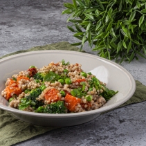 Зеленая гречка с запеченной тыквой, брокколи, зеленым горошком и вялеными томатами