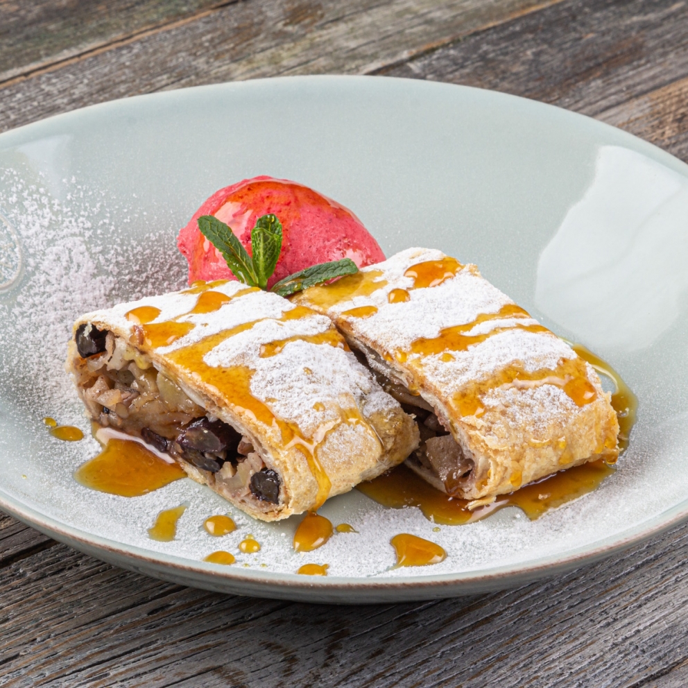 Классический штрудель с яблочной начинкой, изюмом, грецким орехом, пряной корицей и цитрусовым ароматом