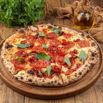 Пицца из дровяной печи со слайсами пикантной Чоризо, сыром Моцарелла, вялеными томатами и базиликом