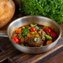 Томленые стейки говядины в ароматном соусе с добавлением чеснока, тимьяна и розмарина, томатной пасты, красного сухого вина, моркови, с помидорами черри, брокколи, зеленым горошком и базиликом