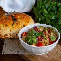 Лепешка из дровяной печи с икрой из запеченных баклажанов, свежих помидоров, красного лука и кинзы