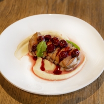 Утиная грудка, пюре из сельдерея с грушей, соус вишнёвый