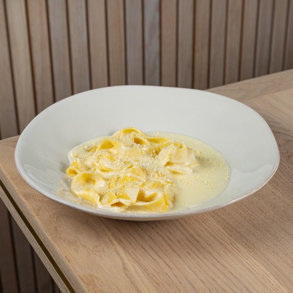 Макаронные изделия отварные, сыр страчателла, вода, масло сливочное, масло чесночное (масло подсолнечное, чеснок), масло оливковое, петрушка, соль морская, перец черный, сливки