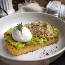 Булочка бриошь с авокадо и тунцом, сыром Креметта, свежим редисом, яйцом пашот и соком лимона