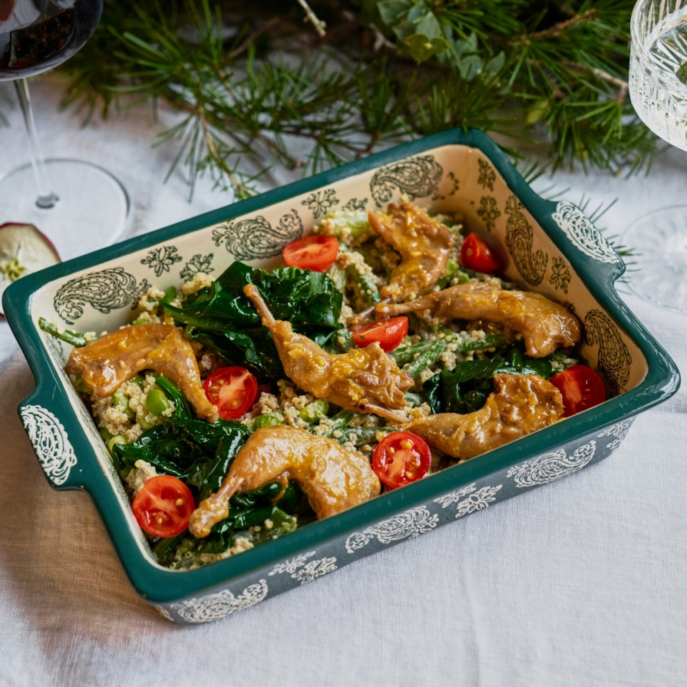 Спаржа, фасоль, бобы, киноа, черри томаты, трюфельный соус, ножки перепелки