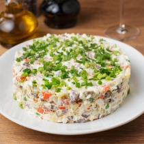 Говядина, яйцо куриное, картофель, морковь, огурцы соленые, специи, горошек зеленый с/м, огурцы свежие, лук зеленый, соль, масло оливковое, майонез