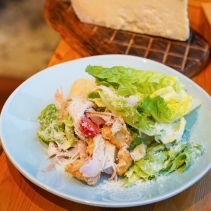 Салат с листьями романо, соусом на основе домашнего майонеза с анчоусами и сыром Пармезан, ломтики индейки сувид, сыр Пармеджано Реджано