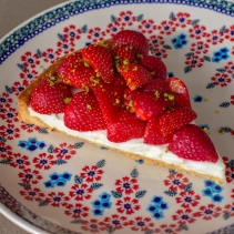 Легкий песочный корж из миндальной муки с нежным кремом из сливочного сыра Креметте, ванилью и свежими ягодами клубники