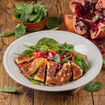 Жареный сыр Халлуми с миксом салатных листьев с добавлением свежей мяты, руколы, томатов, красного лука, печеного болгарского перца, зерен граната и заправкой на основе оливкового масла и орегано