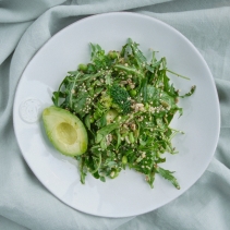 Салат со шпинатом, руколой, спаржей, бобами эдамаме, брокколи и авокадо с виноградно-маковой заправкой и миксом семечек