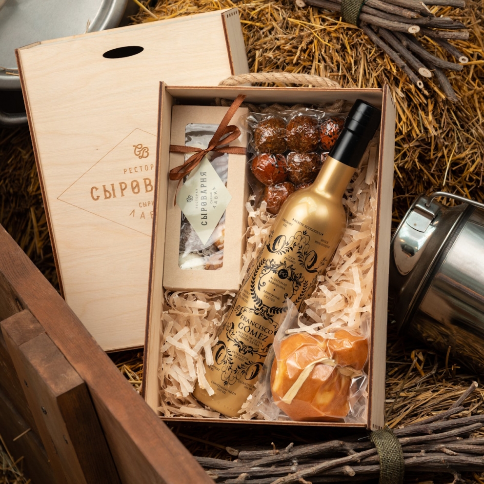 Ящик деревянный (1 шт.), масло оливоковое (500 мл.), Белпер Кнолле (160 гр.), сыр Скаморца копченый (300 гр.), набор конфет ручной работы из Рикотты (1 шт.)