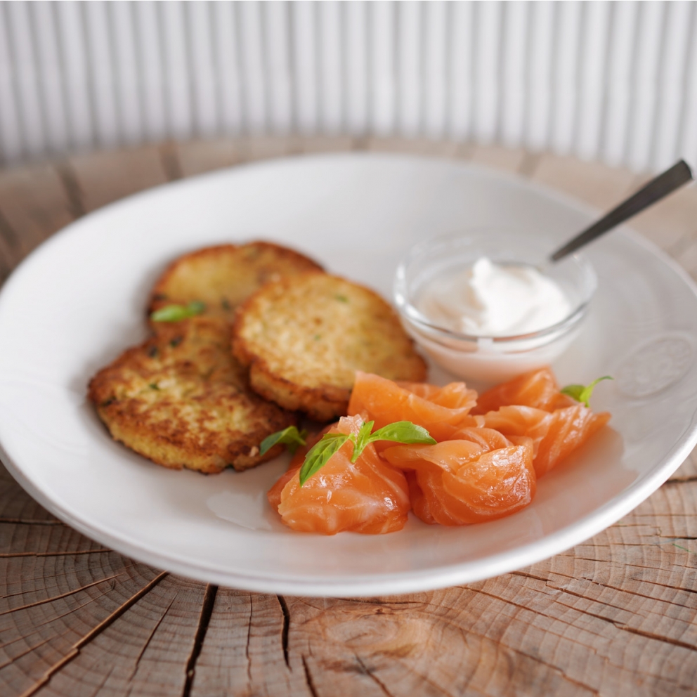 Оладьи из цветной капусты с маринованным лососем, сметаной и томатами