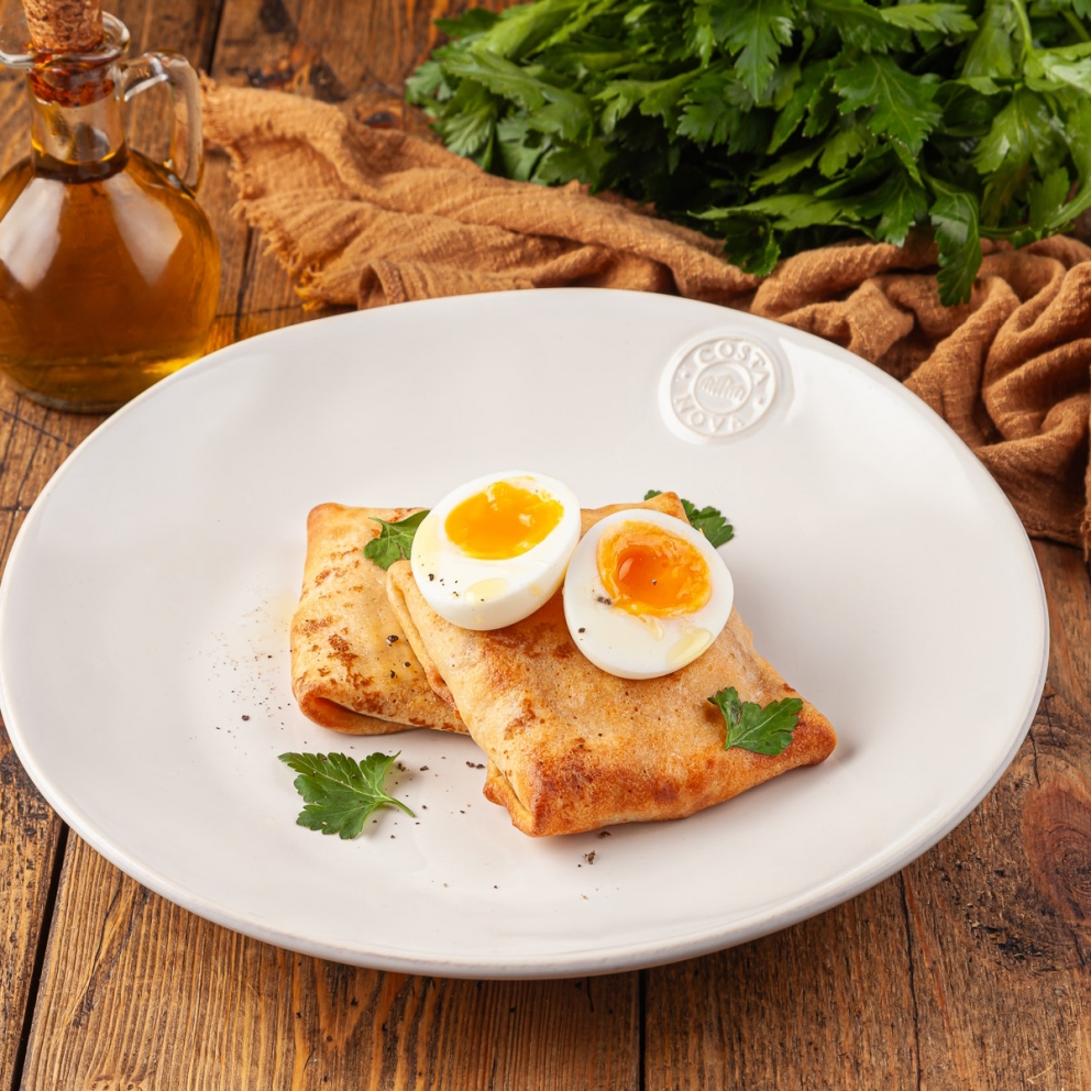 Домашние блины с тамбовским окороком, сыром Чеддер, яйцом и петрушкой