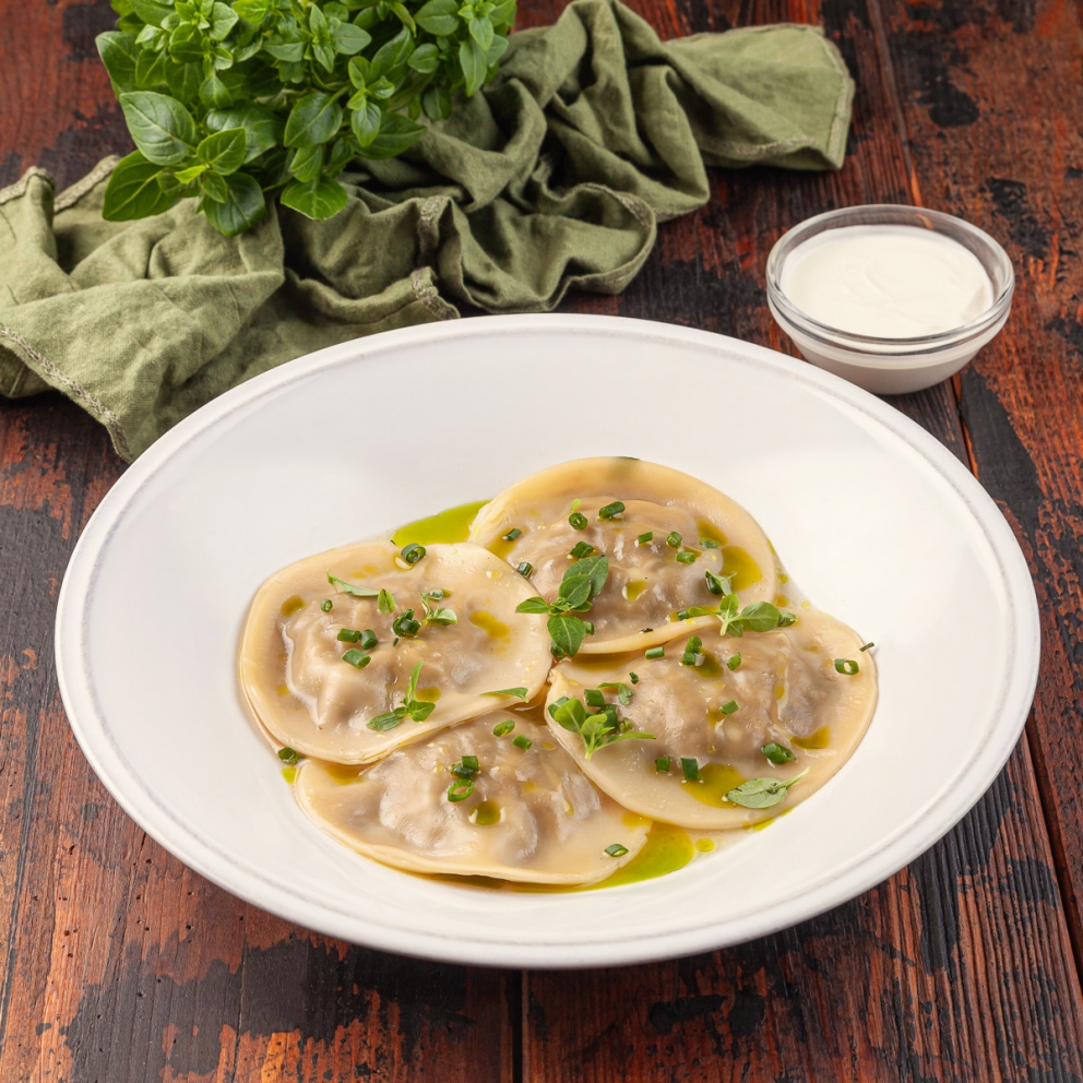 Равиоли с начинкой из белых грибов, вешенок и шампиньонов, с добавлением жареного лука и чеснока, в грибном бульоне с зеленым маслом и соевой сметаной