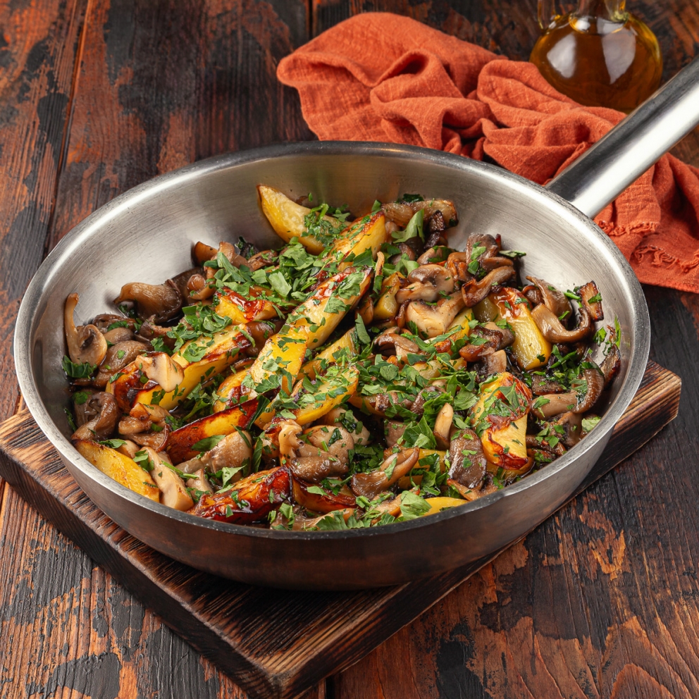 Жаренный на сковороде хрустящий картофель с репчатым луком, чесноком и грибами