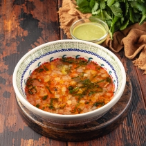Классический суп из тыквы, моркови, сельдерея, томатов пелати, кабачка, фасоли, репчатого лука и картофеля с соусом из свежего шпината