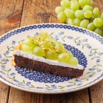 Шоколадный бисквит со сладким виноградом, воздушным кремом из базилика и лепестками из миндаля