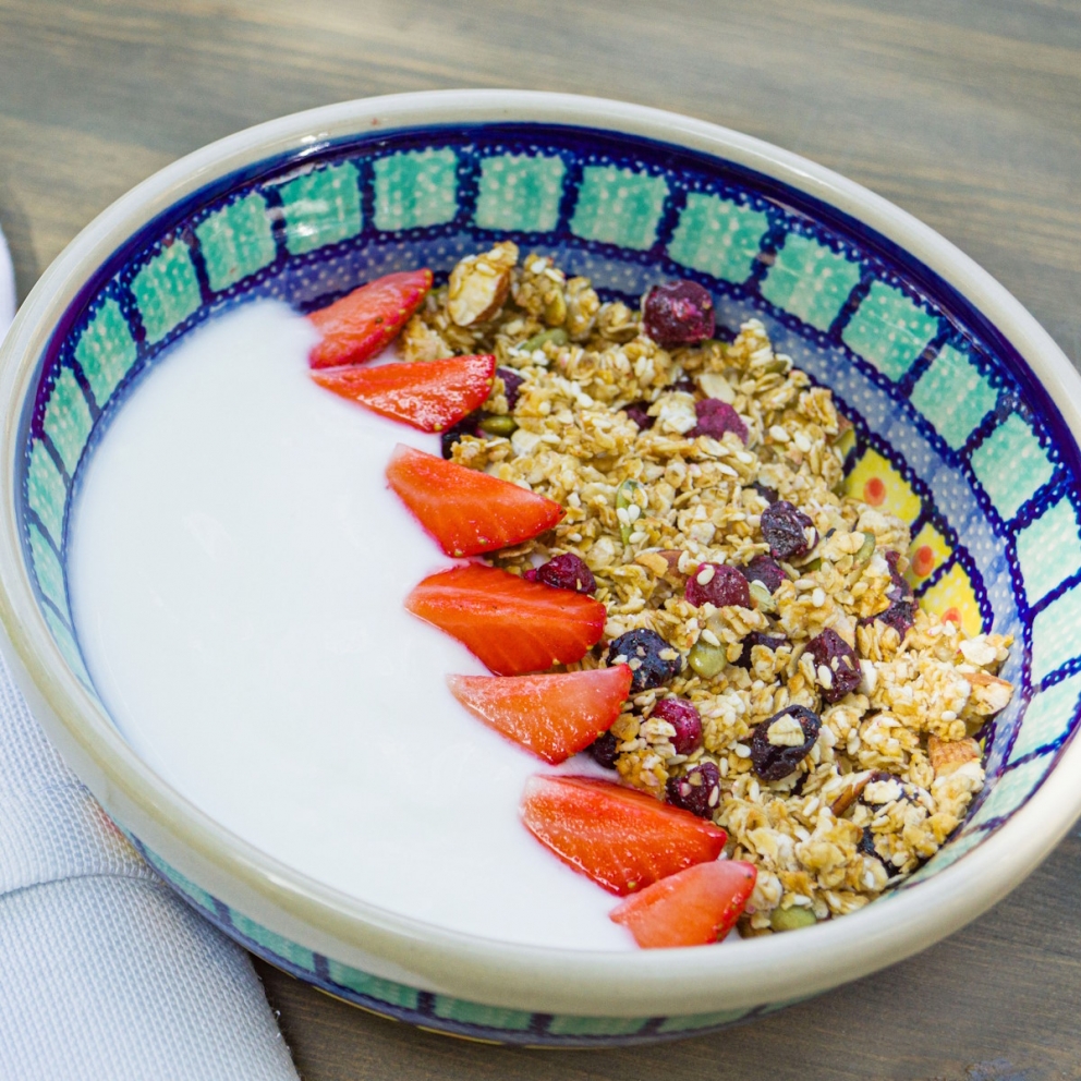 Обжаренная гранола с домашним йогуртом, медом и свежими ягодами