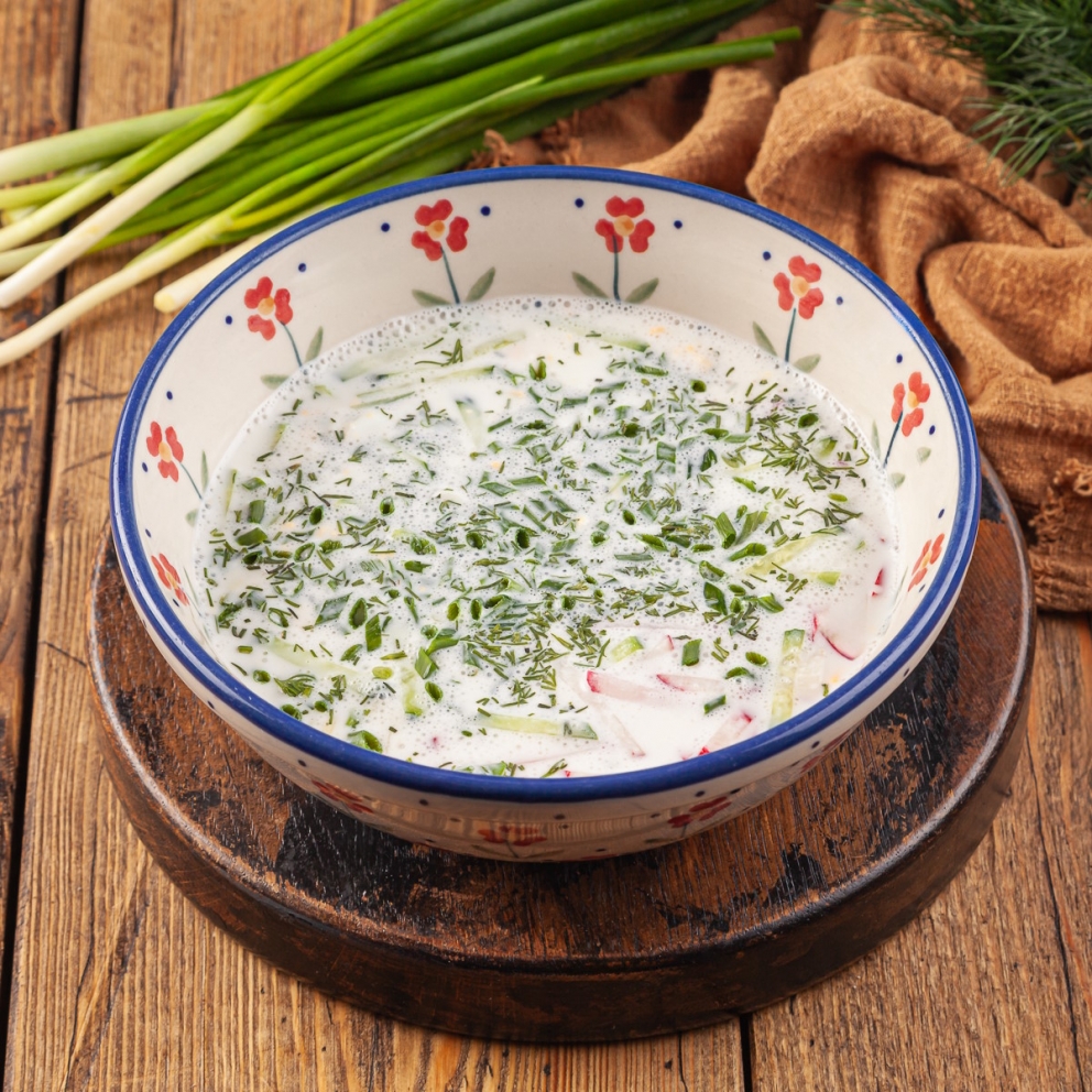 Классическая окрошка на кефире с овощами, томленой говядиной и ароматной свежей зеленью