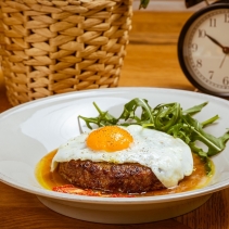 Бифштекс из говядины с сыром Качотта, яйцом, руколой, томатами и кетчупом из сливы