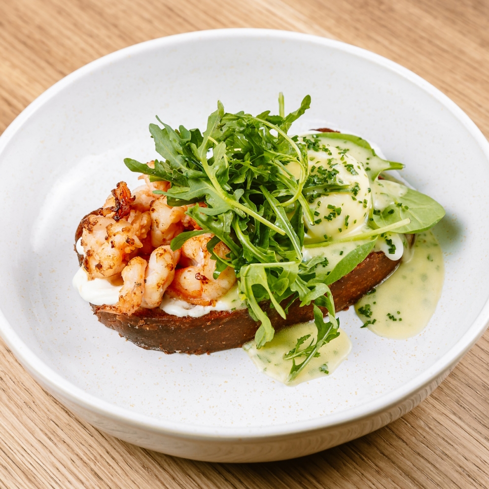 Булочка бриошь с креветками, авторским соусом Голландез и яйцом пашот