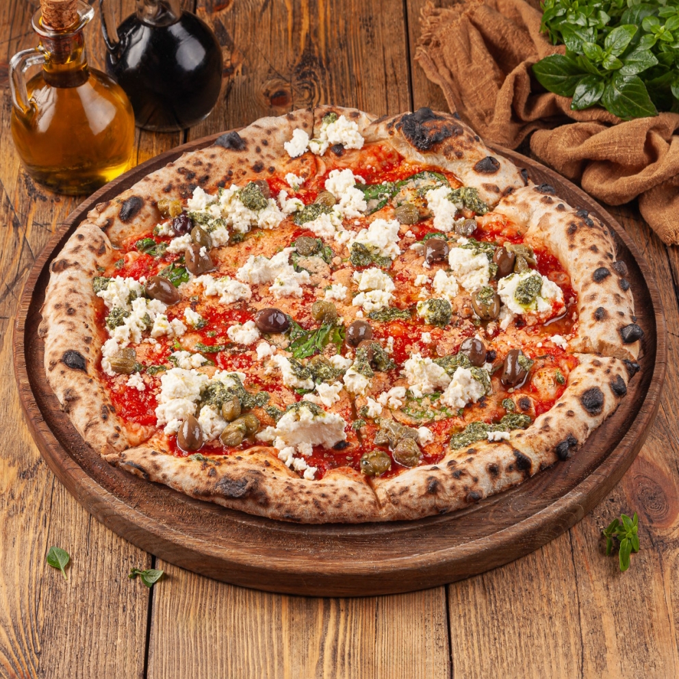 Пицца из дровяной печи с таджасскими оливками, пряными каперсами и нежной Рикоттой