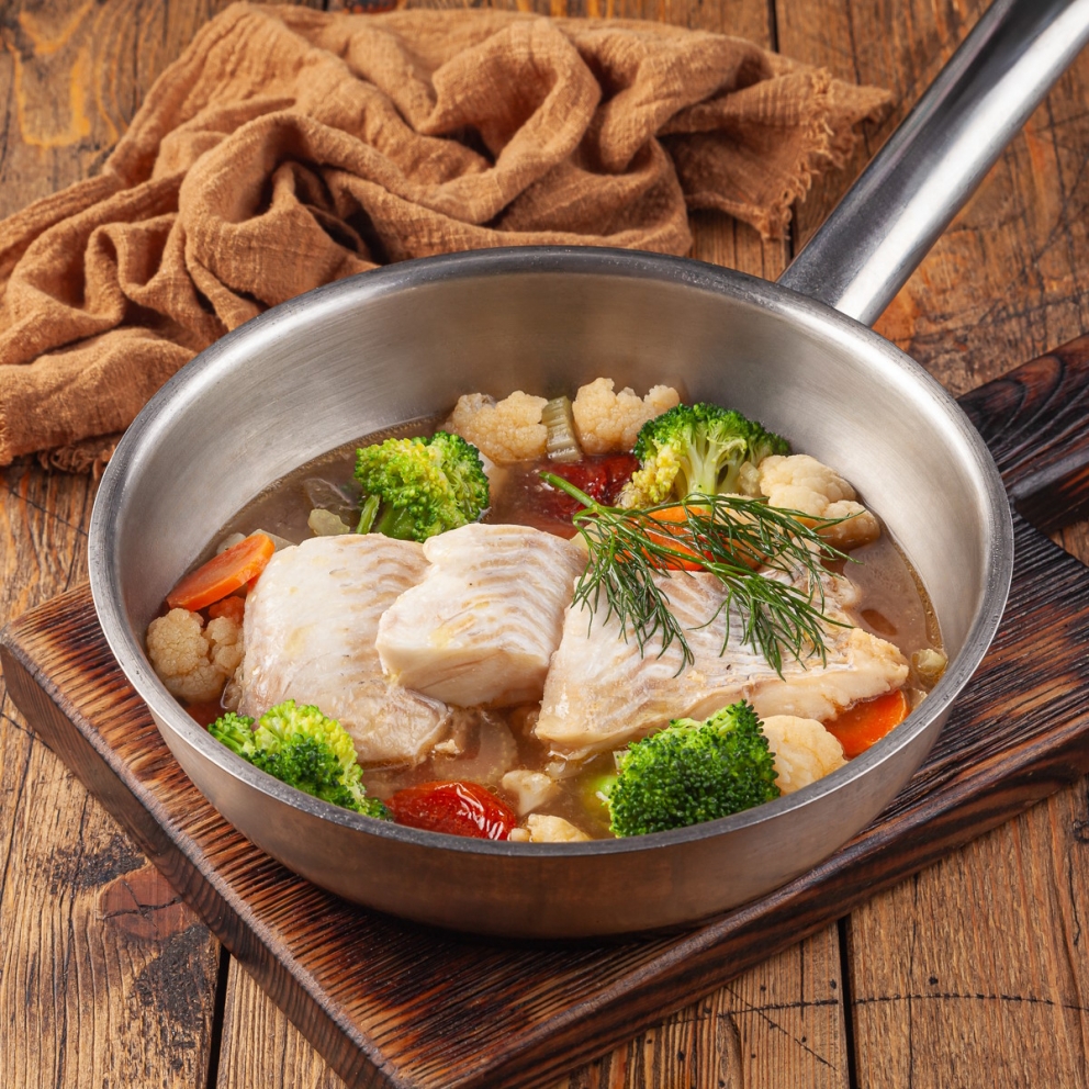 Пикша в соусе биск с цветной капустой, брокколи, морковью и вялеными томатами