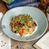 Салат с опаленным лососем, запеченными картофельными дольками, болгарским перцем и кремом чанах