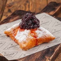 Тесто слоеное бездрожжевое, творог начинка (творог, сахар песок, мука пшеничная в/с, соль экстра, яйцо куриное, сахар ванильный), яйцо куриное, пудра сахарная, варенье брусника (брусника с/м, сахар песок), пудра сахарная