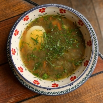 Классический щавелевый суп на говяжьем бульоне с картофелем, морковью, рубленой петрушкой, яйцом и сметаной