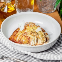 Стейк из молодой капусты с ореховым соусом и миндалем