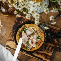 Домашний блин с индейкой су-вид, вялеными томатами и начинкой из сыра Страчателла