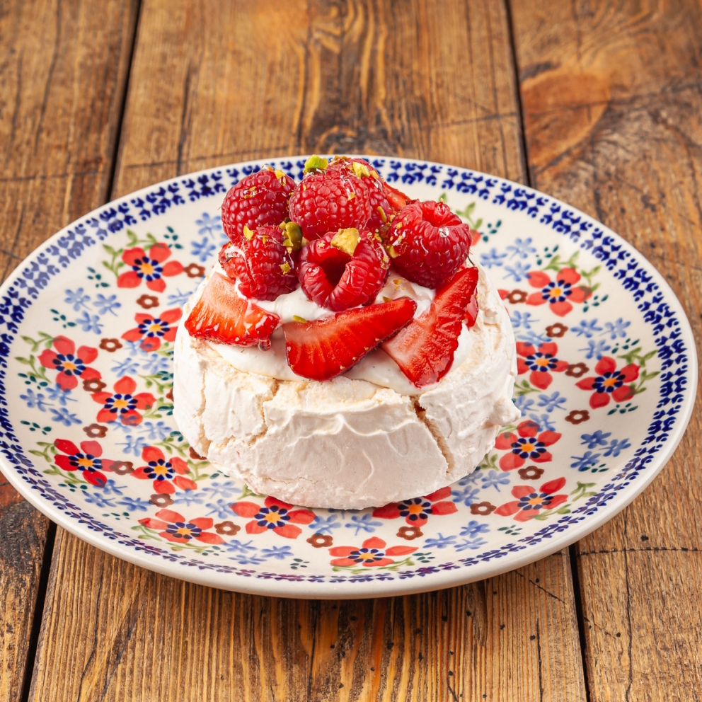 Нежное безе с легким воздушным кремом, свежей клубникой, малиной и фисташками