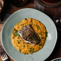 Рис арборио, тимьян, белые грибы, морковныий фреш, куриный бульон, чеснок, сыр пармезан, сливки (33%), филе палтуса, трюфельное масло, зеленыий лук