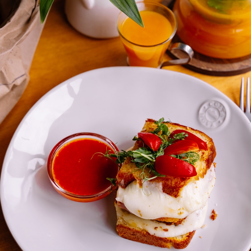 Хрустящие тосты с Моцареллой, сливочно-трюфельным маслом, нежным томатным джемом и помидорами черри