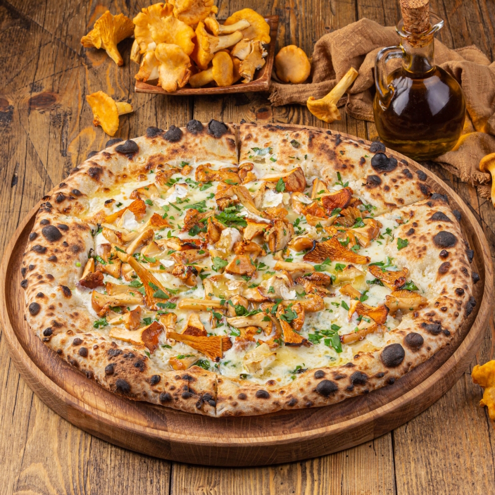 Пицца из дровяной печи с Камамбером, Моцареллой и лисичками
