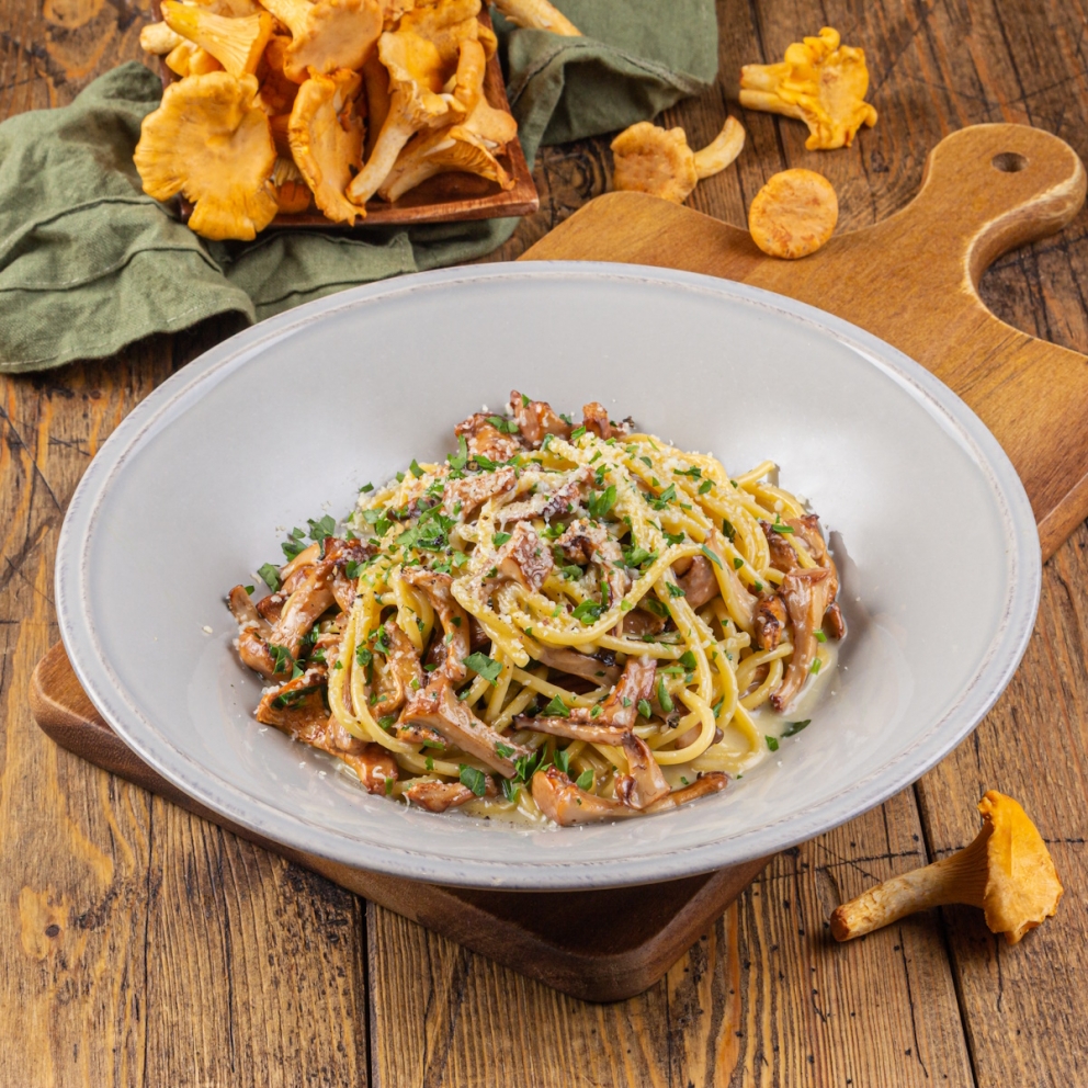 Домашняя паста с жареными лисичками, Пармезаном, петрушкой и соусом из чесночного масла и сушеных белых грибов