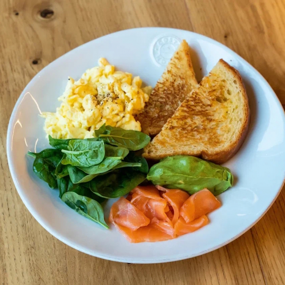 Сливочный скрэмбл со слабосоленым лососем, гуакамоле из авокадо, свежим шпинатом и обжаренной на сливочном масле бриошью