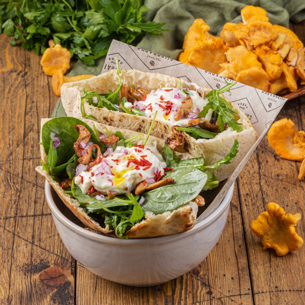 Пита из дровяной печи с жареными лисичками, салатом из руколы, шпината, лука, сушеных томатов и Страчателлой