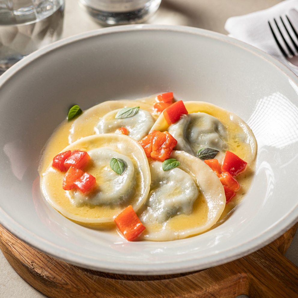 Равиоли с начинкой из нежного сыра Моцарелла и свежего шпината в сливочно-чесночном соусе с болгарским перцем и мини-базиликом