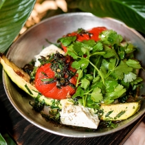 Запеченные на гриле баклажаны, кабачки, болгарский перец с оливковым маслом и зеленью. Подаются с домашней брынзой